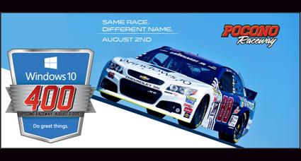 Pocono Raceway and Microsoft announced the renaming of the annual August NASCAR Sprint Cup Series (NSCS) race held at Pocono Raceway as the Windows 10 400.