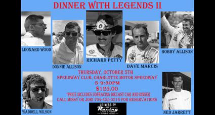 The University of Racing, creators of vintage racing memorabilia and diecast cars, will present the 2nd Annual Dinner With Legends event at Charlotte Motor Speedway on October 5.