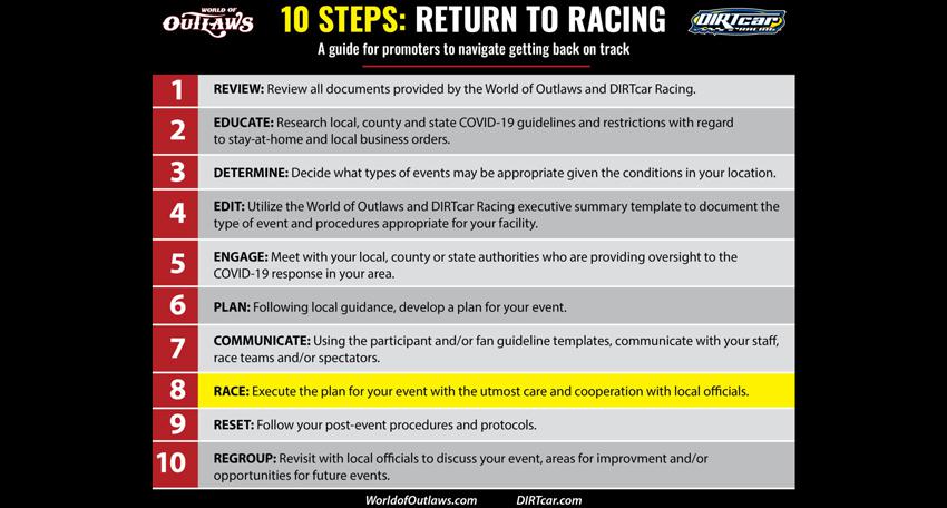 The World of Outlaws and DIRTcar Racing have announced the launch of the Return To Racing initiative, along with a new Resource Center available on the two organizations' websites (worldofoutlaws.com and dirtcar.com).