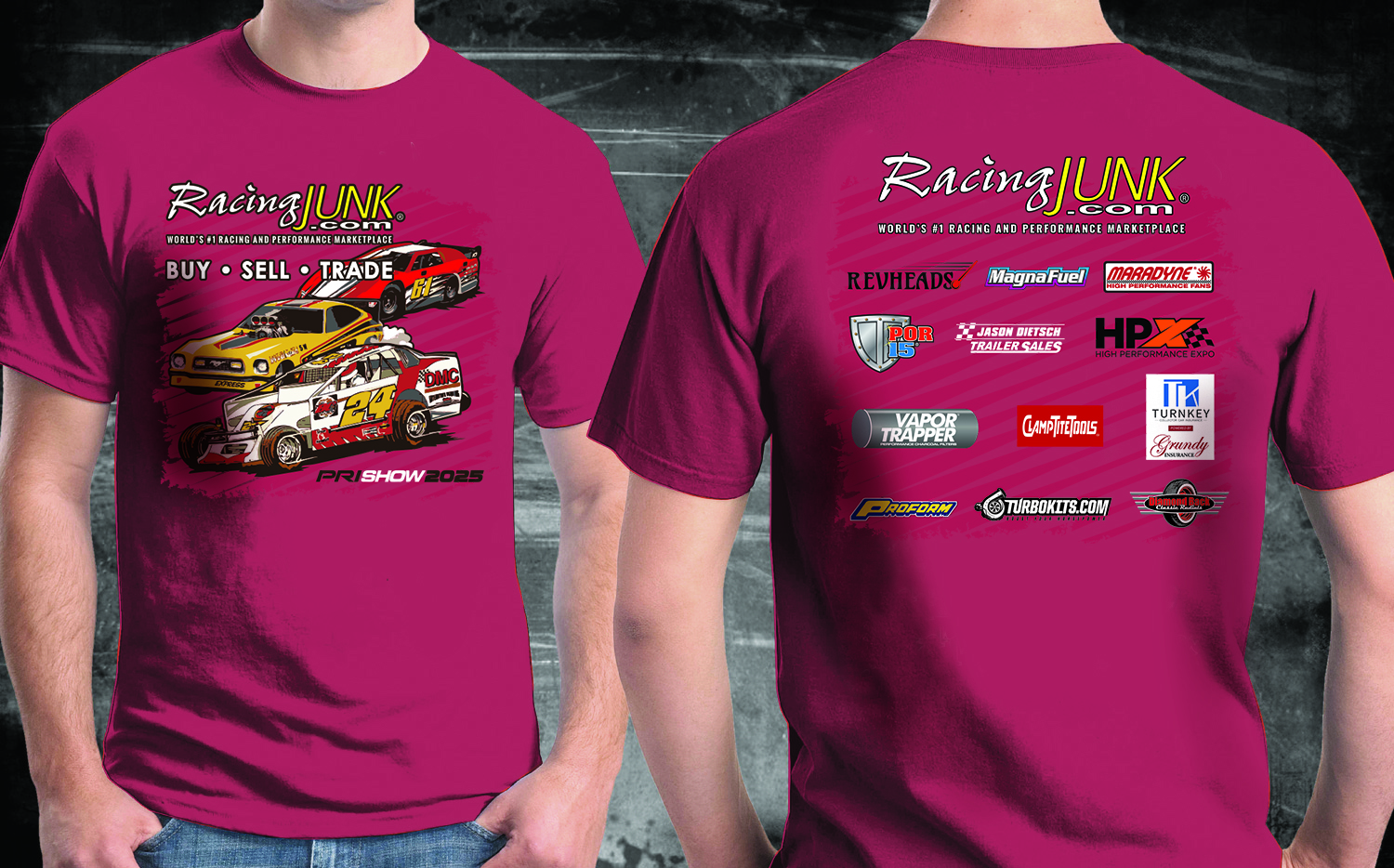And of course, the t-shirts! This year’s t-shirt is near and dear to the RacingJunk family’s heart. It features the last race vehicle driven by former staff and race community member Bobby Chalmers, who passed away in July. Staff will distribute more than 4000 t-shirts which celebrate the grassroots racers, builders and enthusiasts in the community. Returning PRI attendees know the drill – put the t-shirt on at the booth, and twice a day, the RacingJunk models reward an attendee wearing the shirt on the show floor with a $100 cash prize.
